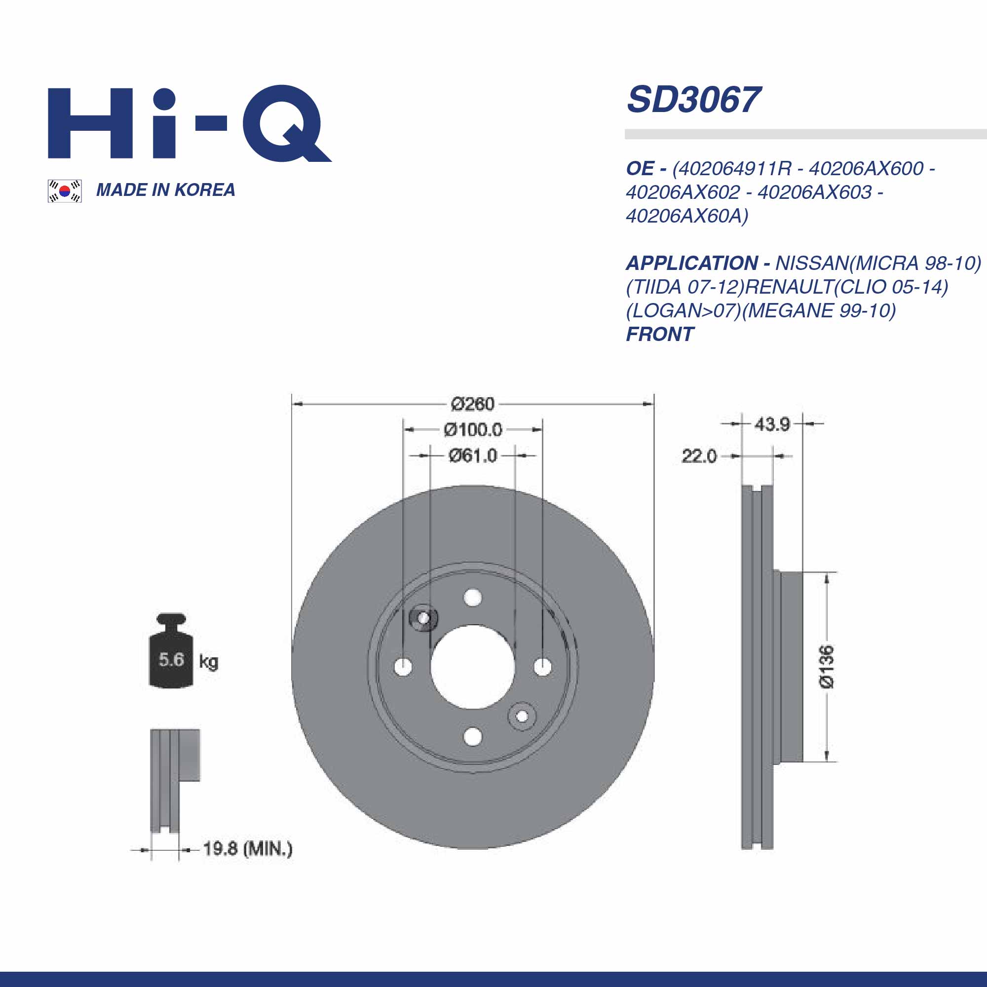 HI-Q DISC SD3067 NISSAN(MICRA 98-10)(TIIDA 07-12)RENAULT(CLIO 05-14)(LOGAN>07)(MEGANE 99-10) FRTSelect options