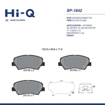 HI-Q PAD| SP-1842 HYUNDAI(ELANTRA 10-16)(VELOSTER 11-17)(I30 >11) KIA(CERATO >13) FRTSelect options