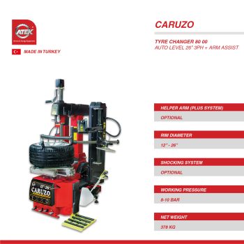 ATEK CARUZO TIRE CHANGER LEVERLESS- 26″ 3PH + ARM ASSIST | 80 00 مكنة غيار دواليب ليفيه أوتوماتيك