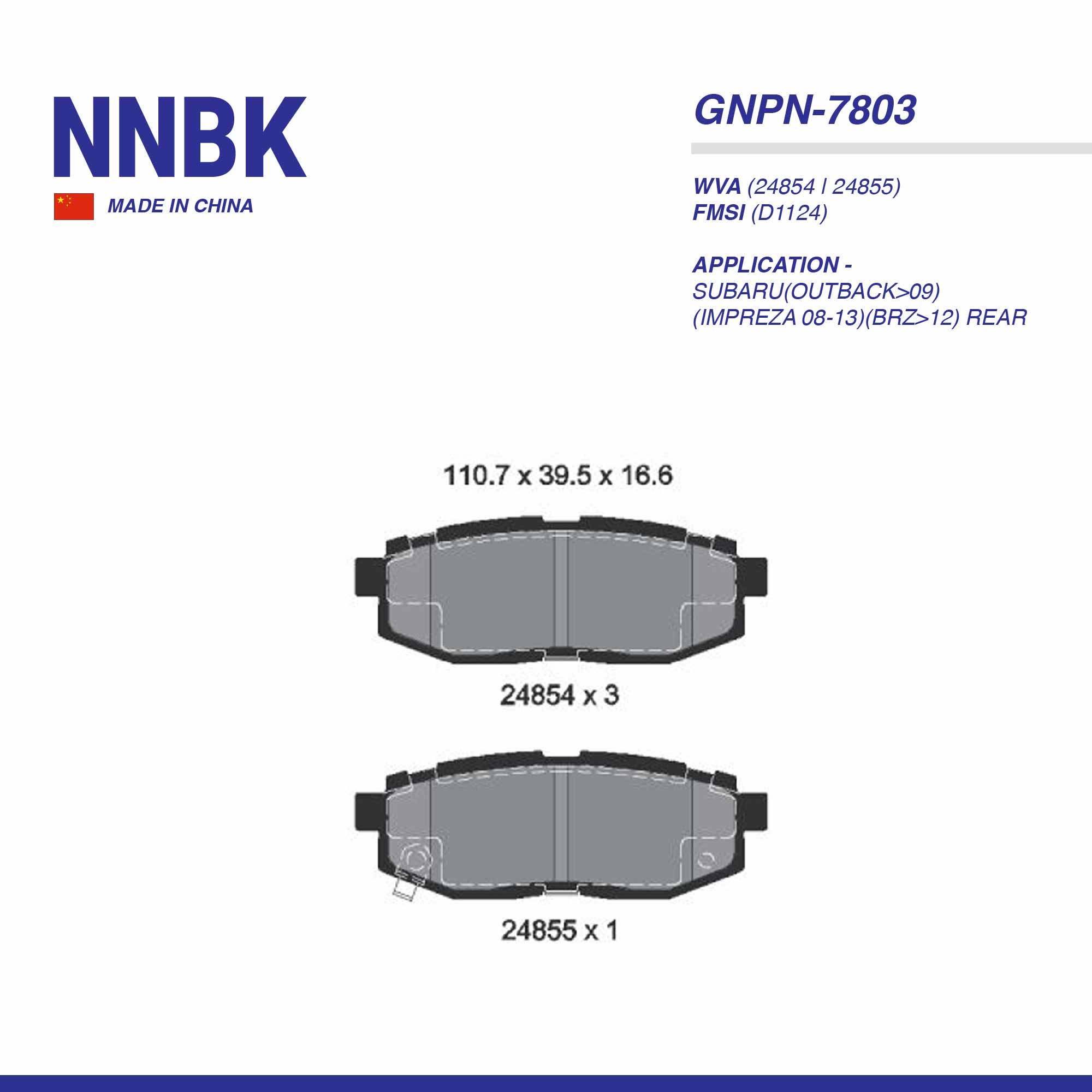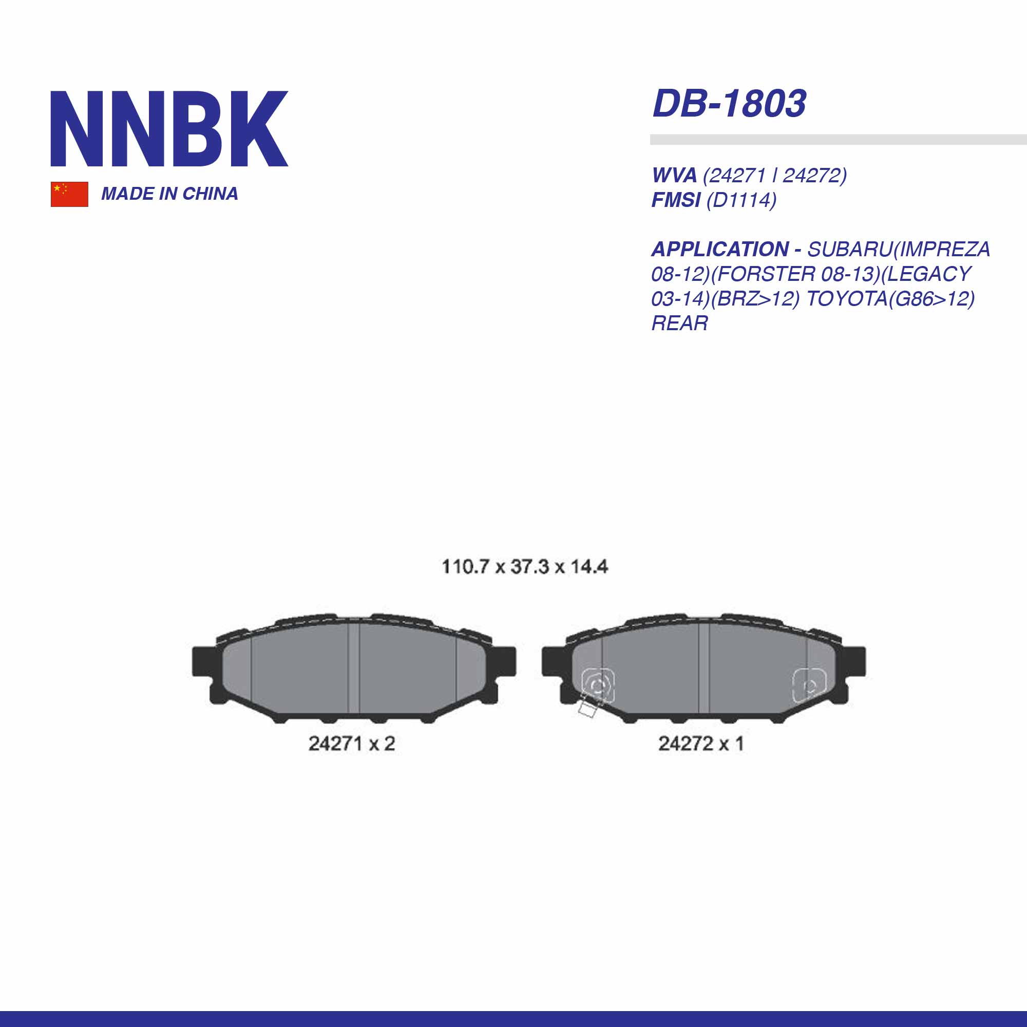 NA PAD| DB-1803 SUBARU(IMPREZA 08-12)(FORSTER 08-13)(LEGACY 03-14)(BRZ>12) TOYOTA(G86>12) RR