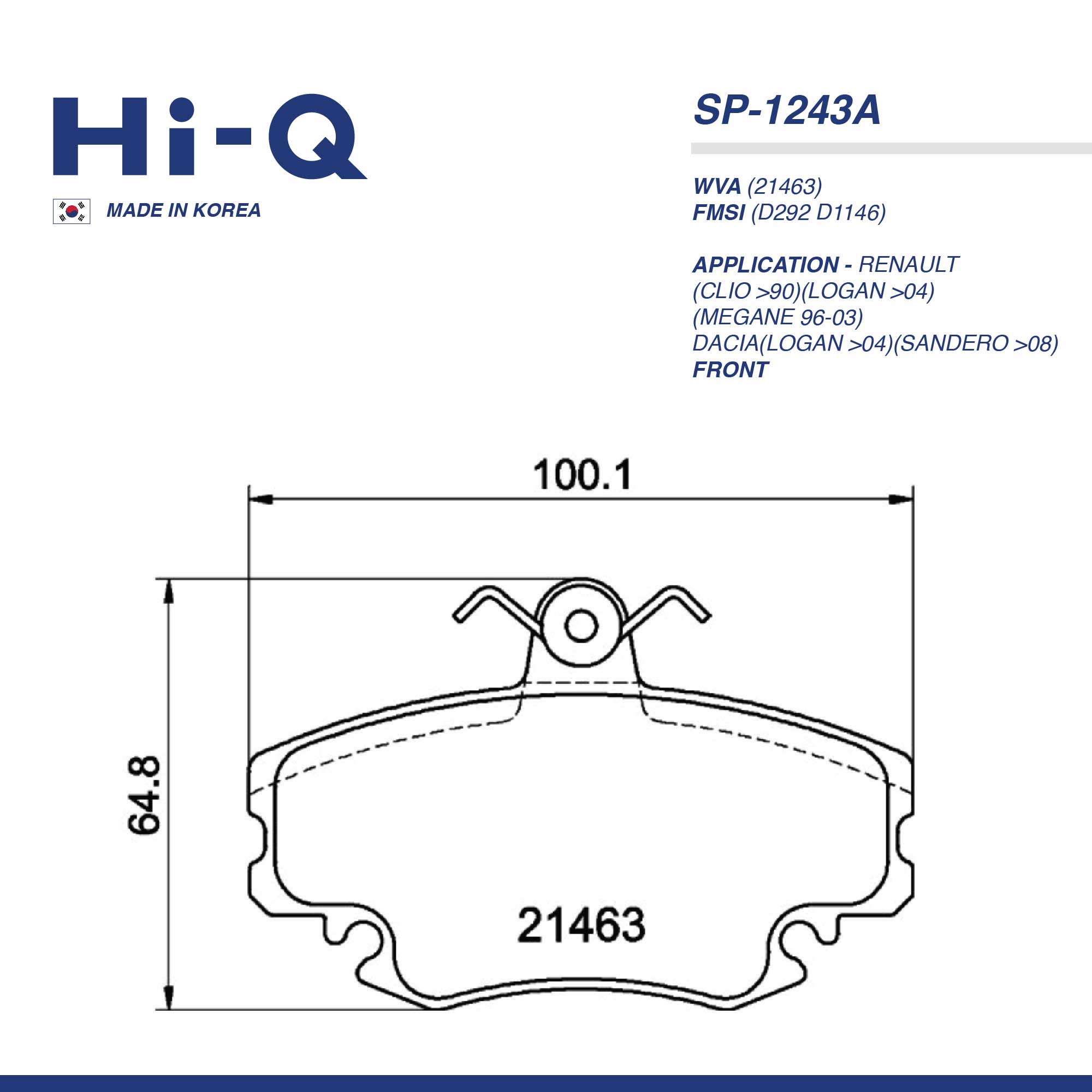 HI-Q PAD| SP-1243A RENAULT(CLIO >90)(LOGAN >04)(MEGANE 96-03) DACIA(LOGAN >04)(SANDERO >08) FRT