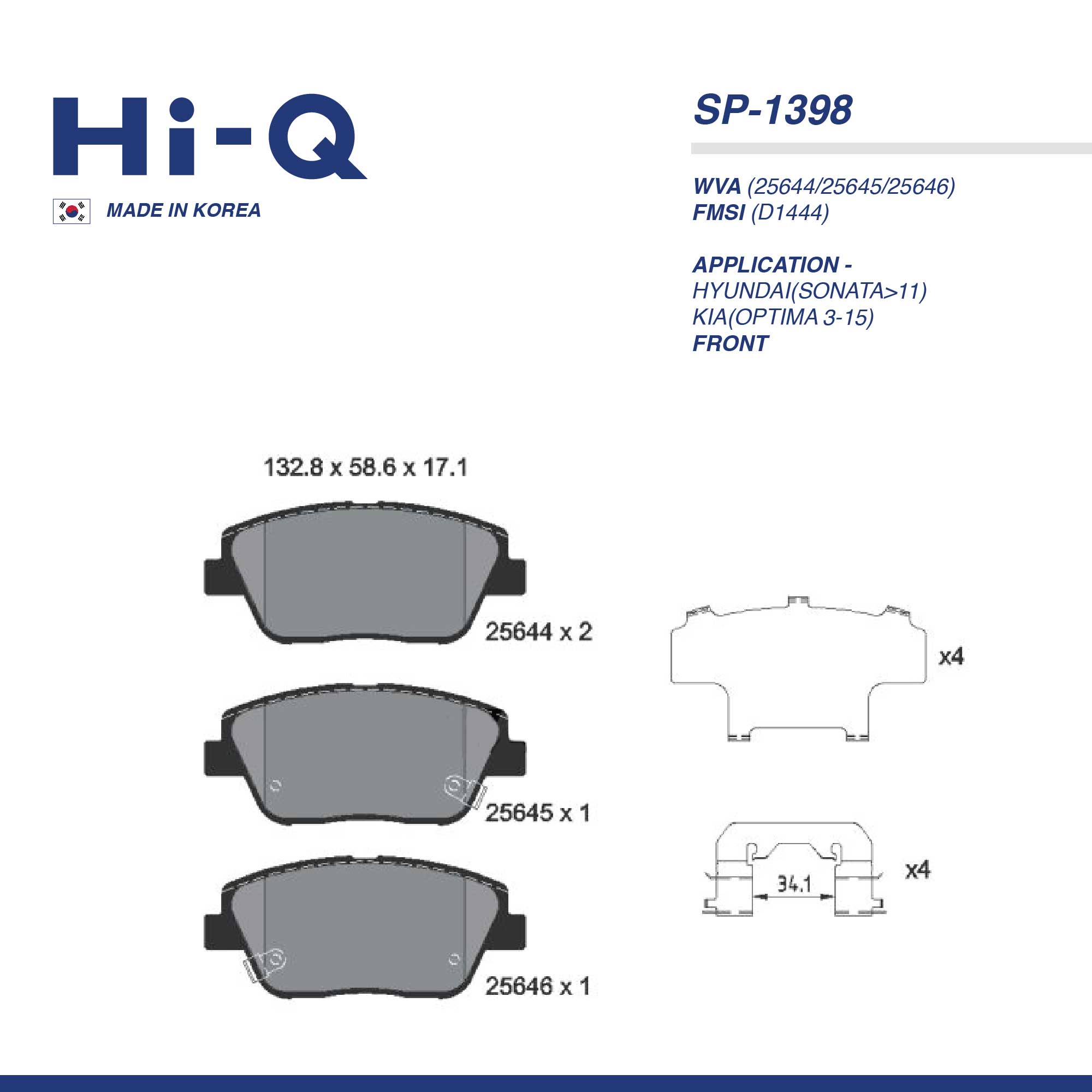 HI-Q PAD| SP-1398 HYUNDAI(SONATA>11) KIA(OPTIMA 3-15) FRT
