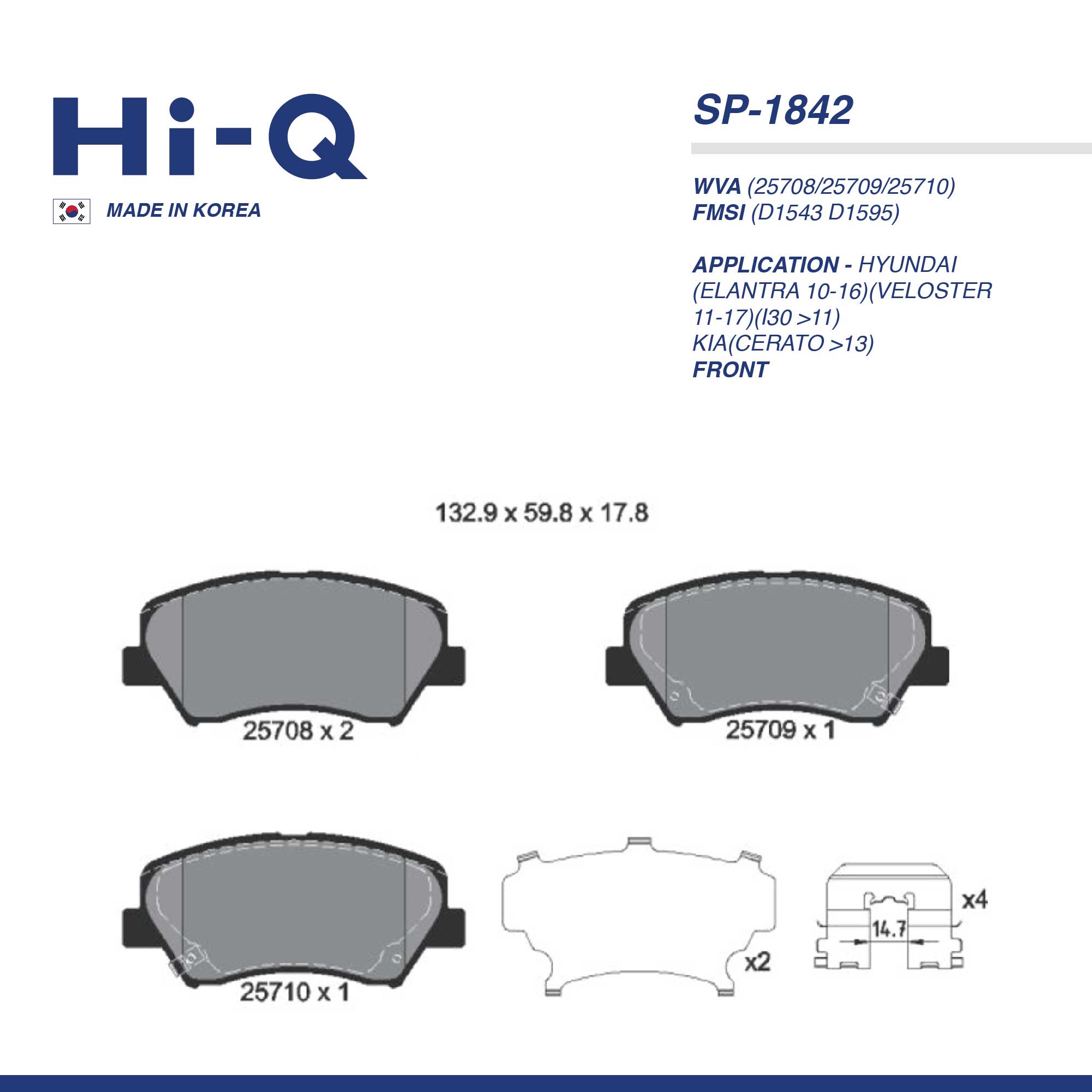 HI-Q PAD| SP-1842 HYUNDAI(ELANTRA 10-16)(VELOSTER 11-17)(I30 >11) KIA(CERATO >13) FRT