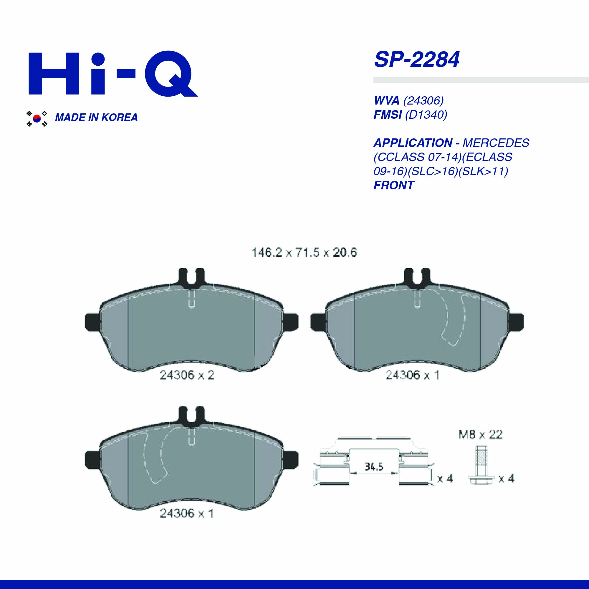 HI-Q PAD| SP-2284MERCEDES(CCLASS 07-14)(ECLASS 09-16)(SLC>16)(SLK>11) FRT