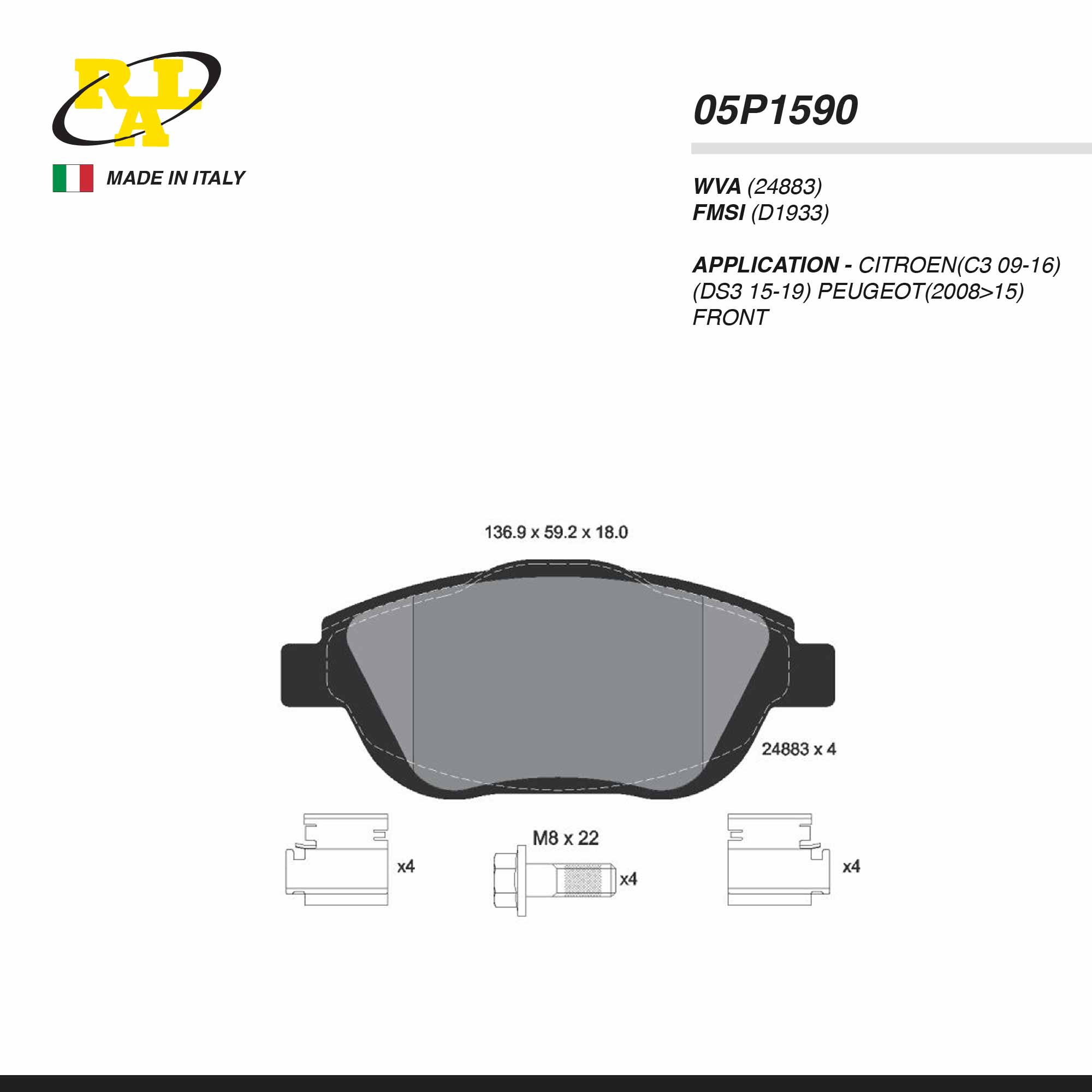 RAL PAD| 05P1590 CITROEN(C3 09-16)(DS3 15-19) PEUGEOT(2008>15) FRT